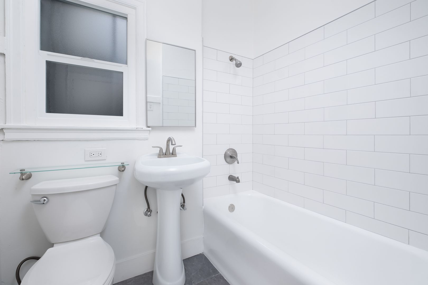 - Bathroom: Shower/Tub combo surround by white subway tile and tile flooring
