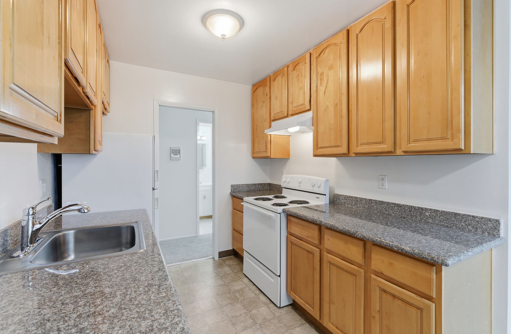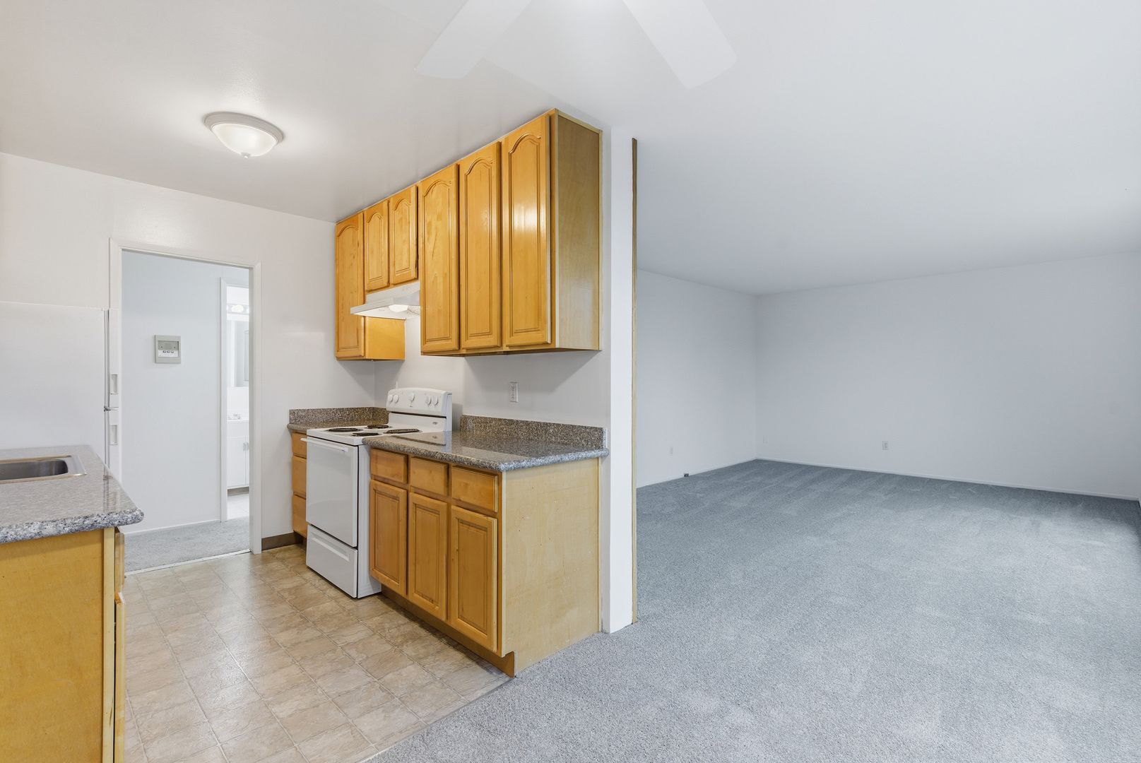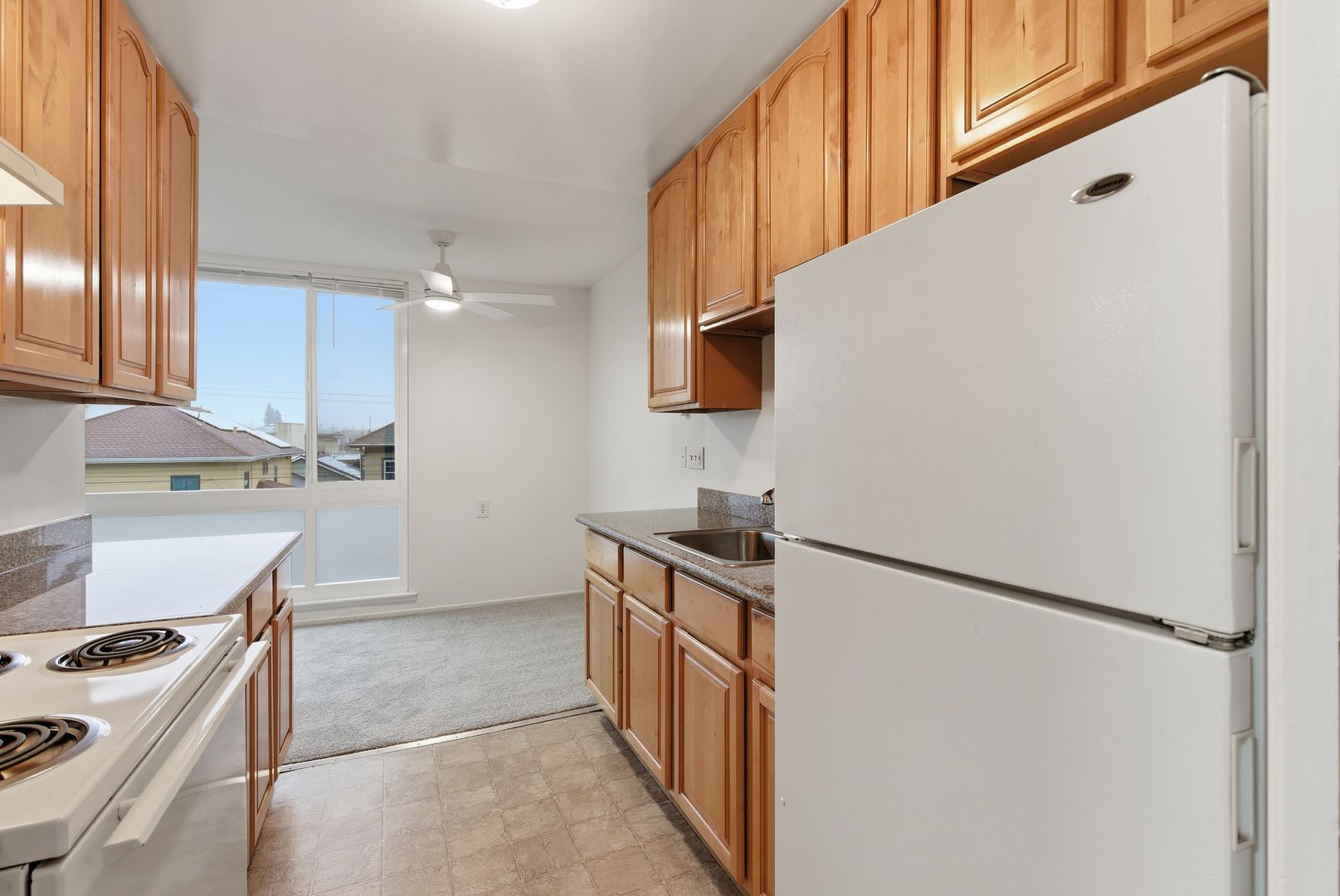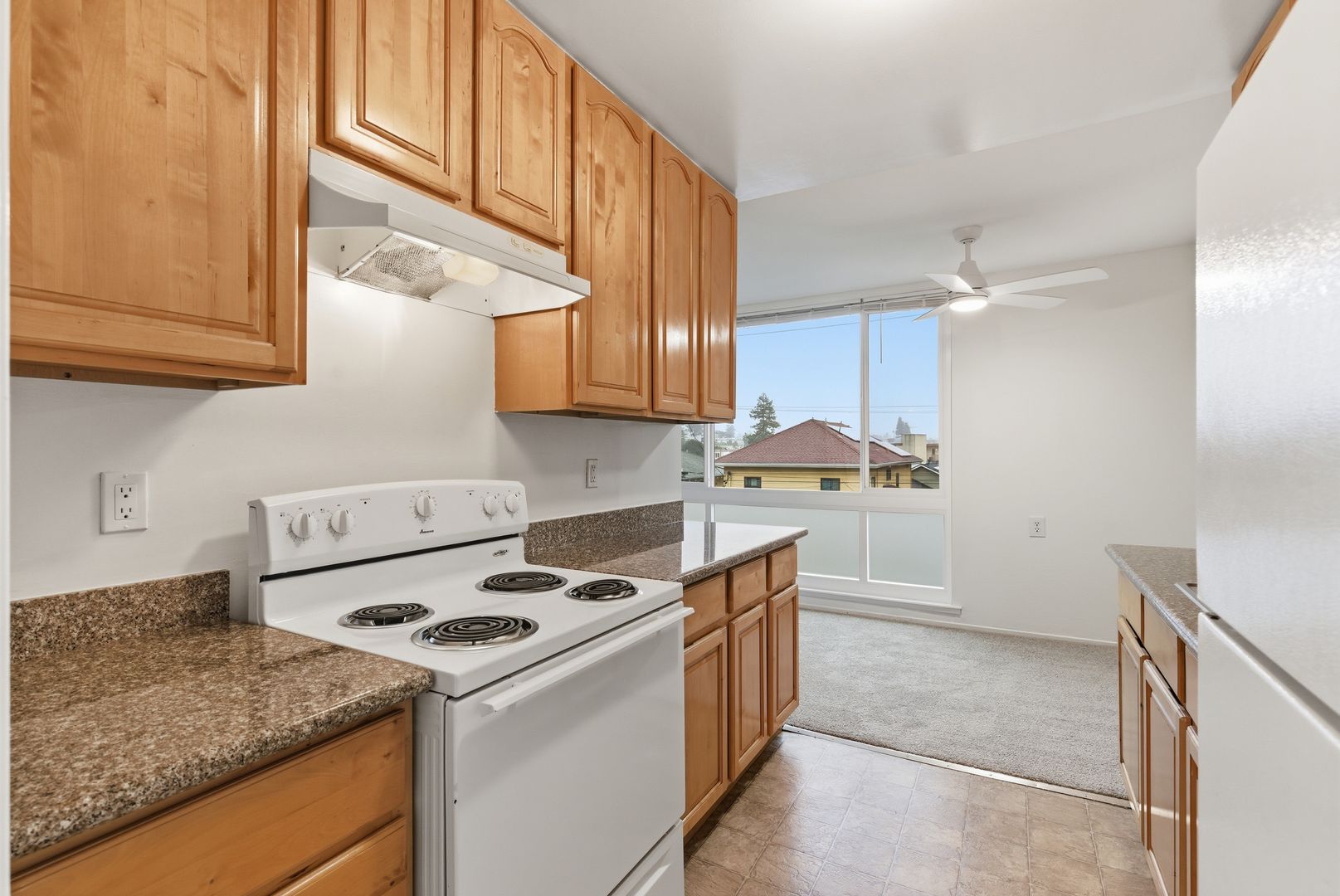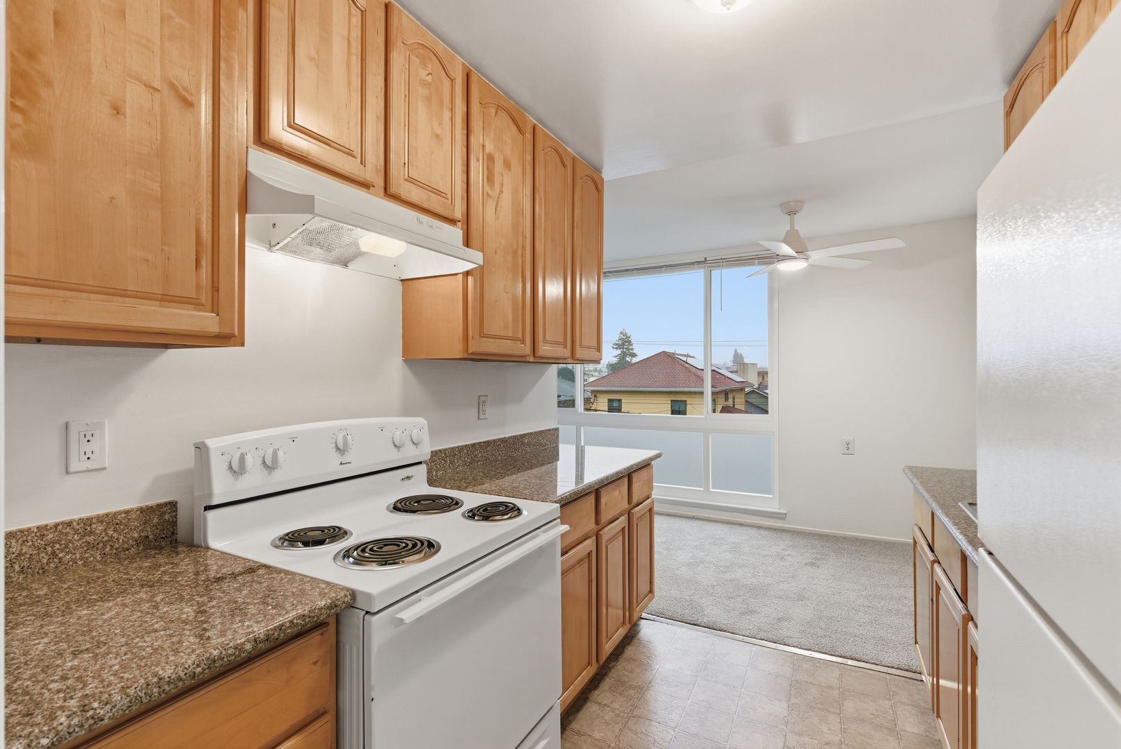 - Updated Kitchen with electric range, refrigerator + ample cabinets