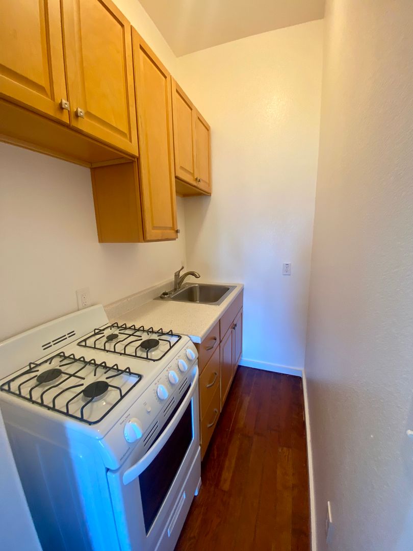 This quaint top floor studio is located in an eight unit building situated up off the street and offers high ceilings and hardwood floors throughout. The kitchen includes a decent amount of cabinetry and a new appliances. A standalone shower can be found in the bathroom.